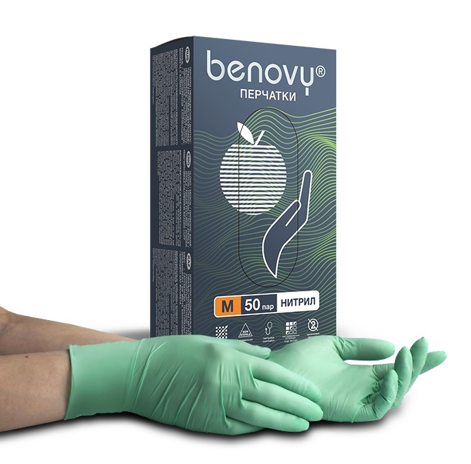 - Перчатки нитриловые Benovy Nitrile MultiColor разм. S 100 шт/упк (зеленые)